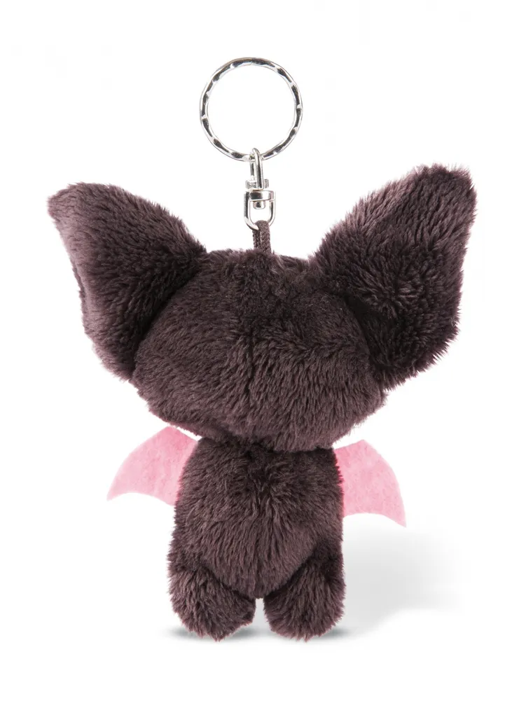 Fledermaus Baako ist ein sogenannter NICI Bean Bag, er hat einen Schlüsselring aus silbernem Metall am Kopf und besticht durch seine putzigen rosa Öhren. Die gold-glitzernden Augen im Kontrast zu dem dunklen Fell machen ihn zu einem knuffigen Highlight.